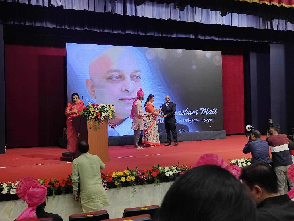 Advocate Prashant Mali Got Best Cyber and Privacy lawyer of the year by the hands of Makrand Deshpande , other awardees include Mumbai Mayor Kishori Pednekar, ex Mumbai Police Commissioner Hemant Nagrale , VC of University of Mumbai, Hon. Sharad Pawar n others . Lop Devendra Phadnavis and MP Sanjay Raut were chief guests